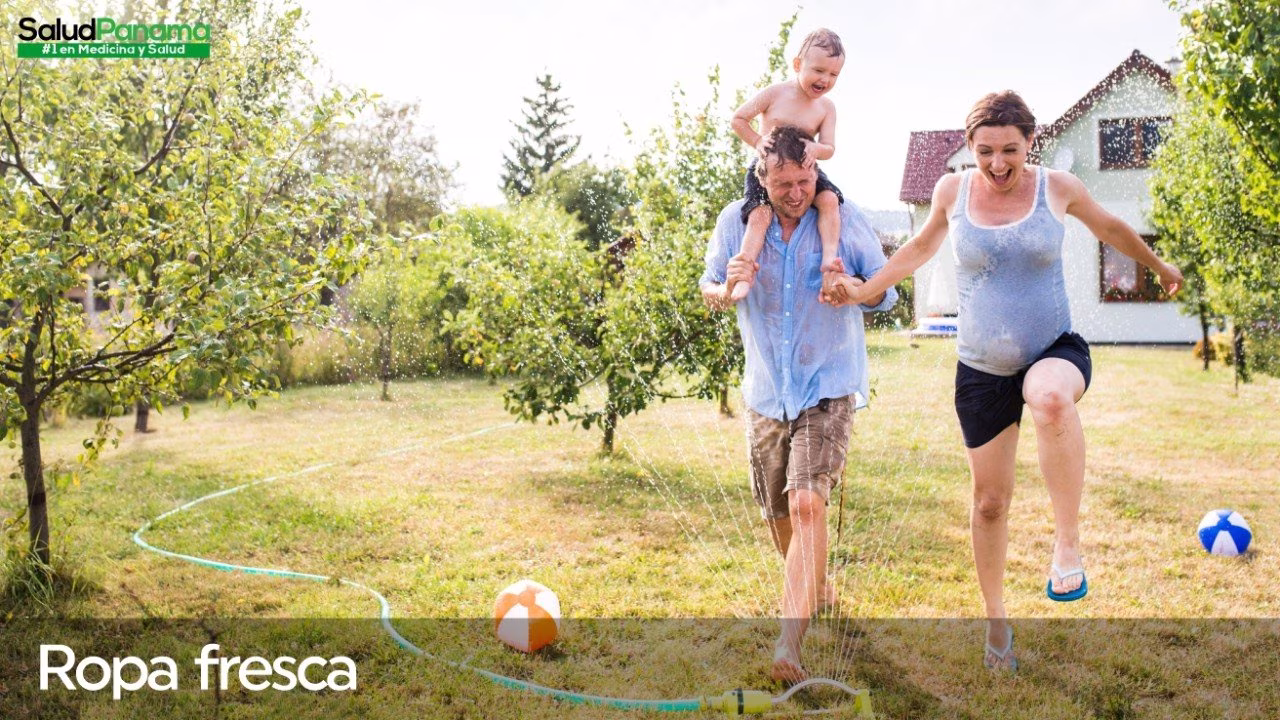 Ropa fresca: Es recomendable utilizar ropa fabricada con fibras naturales y de color claro, con pantalla de protección solar preferible. La ropa debe ser cómoda, que de libertad a los movimientos y no oprima o apriete; de colores claros, que reflejen el calor hacia el exterior (las oscuras absorben el calor); que sean de poco grosor, lo que facilita la eliminación del calor por conducción; y de materiales transpirables como el hilo y el algodón, que facilitan la transpiración y evaporación del sudor, facilitando con ello el adecuado funcionamiento de los mecanismos de regulación térmica del organismo.